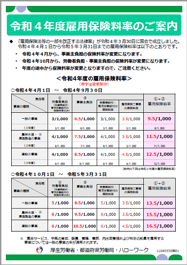 令和4年10月1日~令和5年3月31日まで適用される雇用保険料率が引き上げられました。