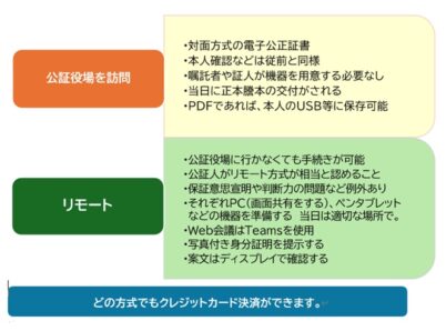 ① 公正証書の内容によりリモートが法で規制されている等の理由でリモート式ができないものがあります。